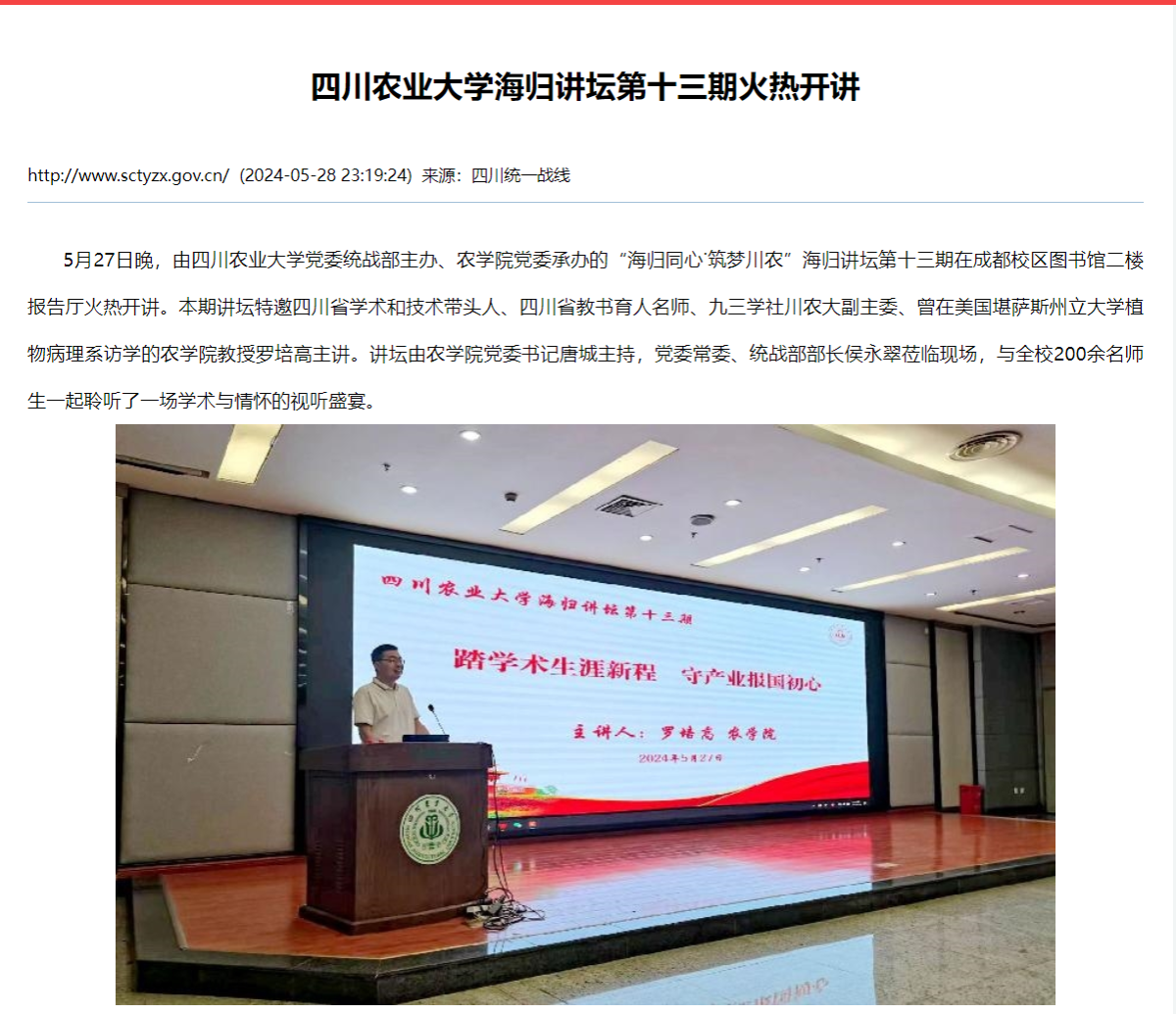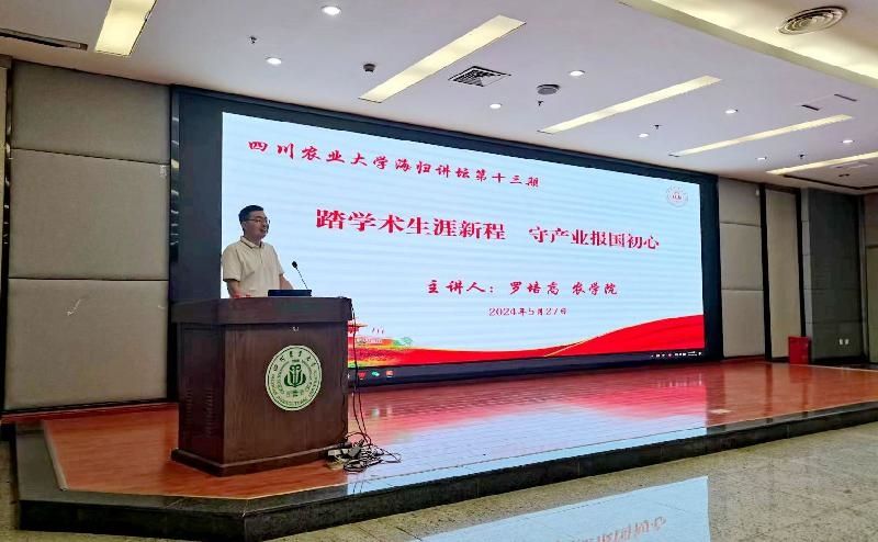5月27日晚,由太阳集团tyc86党委统战部主办、农学院党委承办的“海归同心˙筑梦川农”海归讲坛第十三期在成都校区图书馆二楼报告厅火热开讲。本期讲坛特邀四川省学术和技术带头人、四川省教书育人名师、九三学社川农大支社、曾在美国堪萨斯州立大学植物病理系访学的农学院教授罗培高主讲。讲坛由农学院党委书记唐城主持,党委常委、统战部部长侯永翠莅临现场,与全校200余名师生一起聆听了一场学术与情怀的视听盛宴。