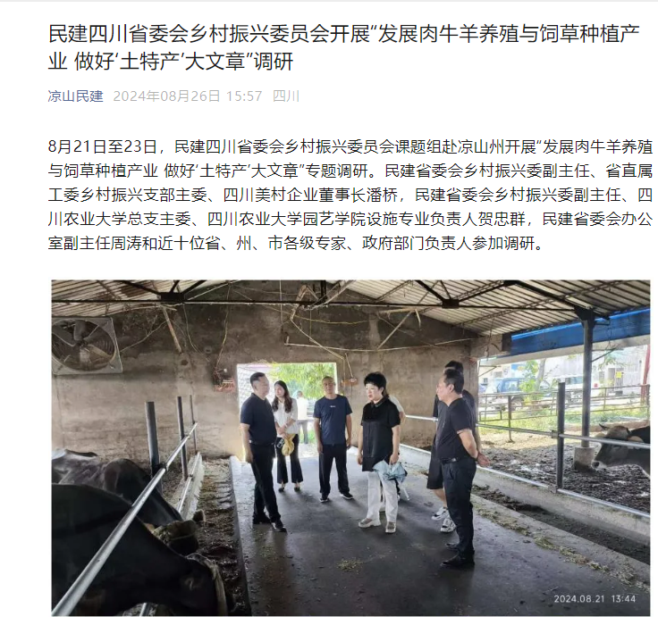 “发展肉牛羊养殖与饲草种植产业,做好‘土特产’大文章”是今年民建四川省委会重点调研课题,乡村振兴委作为课题承担单位,积极担当作为,聚焦主题,为推动特色产业发展、助力乡村振兴献计出力。