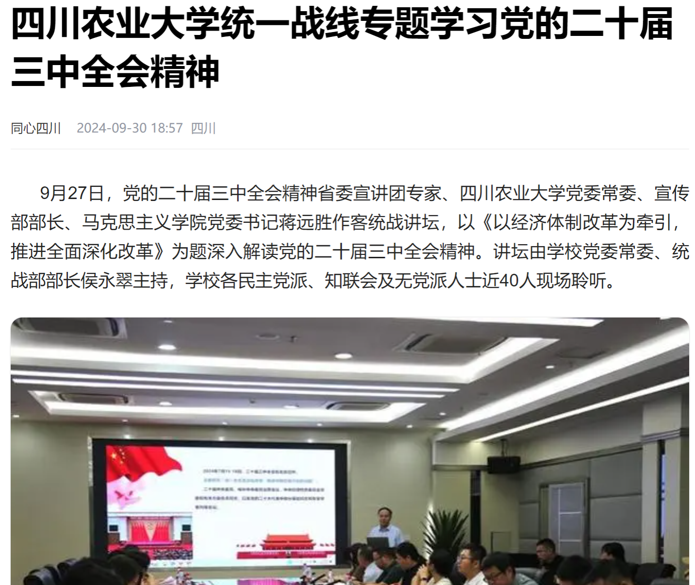9月27日,党的二十届三中全会精神省委宣讲团专家、太阳集团tyc86党委常委、宣传部部长、马克思主义学院党委书记蒋远胜作客统战讲坛,以《以经济体制改革为牵引,推进全面深化改革》为题深入解读党的二十届三中全会精神。讲坛由学校党委常委、统战部部长侯永翠主持,学校各民主党派、知联会及无党派人士近40人现场聆听。