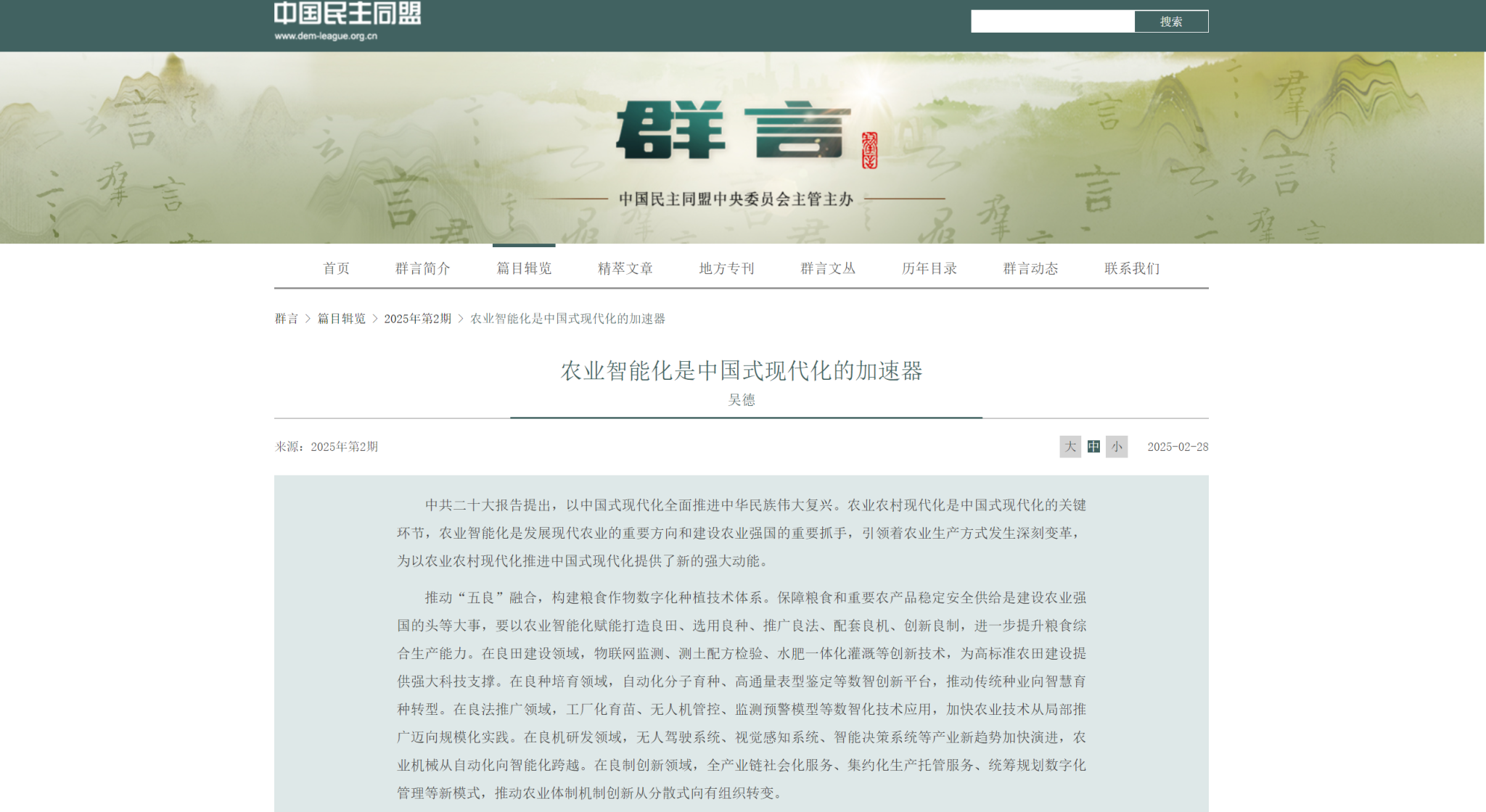 中共二十大报告提出,以中国式现代化全面推进中华民族伟大复兴。农业农村现代化是中国式现代化的关键环节,农业智能化是发展现代农业的重要方向和建设农业强国的重要抓手,引领着农业生产方式发生深刻变革,为以农业农村现代化推进中国式现代化提供了新的强大动能。
