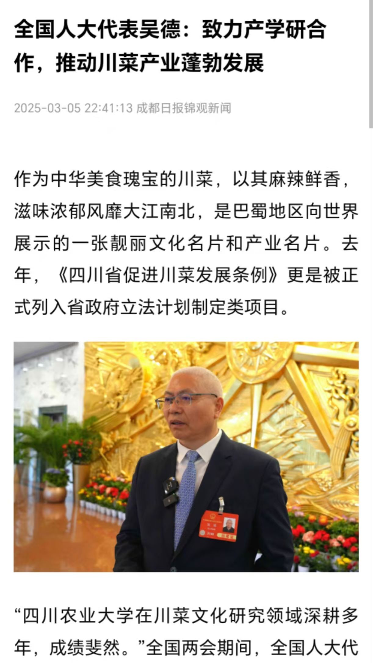 作为来自高校的全国人大代表,人才培养一直是吴德所关注的话题。他告诉记者,他所在的大学在川菜人才培养方面设置了川菜加工工艺学、川菜加工原理等特色课程,以及食品智能制造和慢性病营养学等课程,拓宽围绕川菜加工原理深入化、技术现代化和营养健康化等科学问题的研究方向,从人才输送和科技赋能层面顺应和推进川菜产业高质量发展。