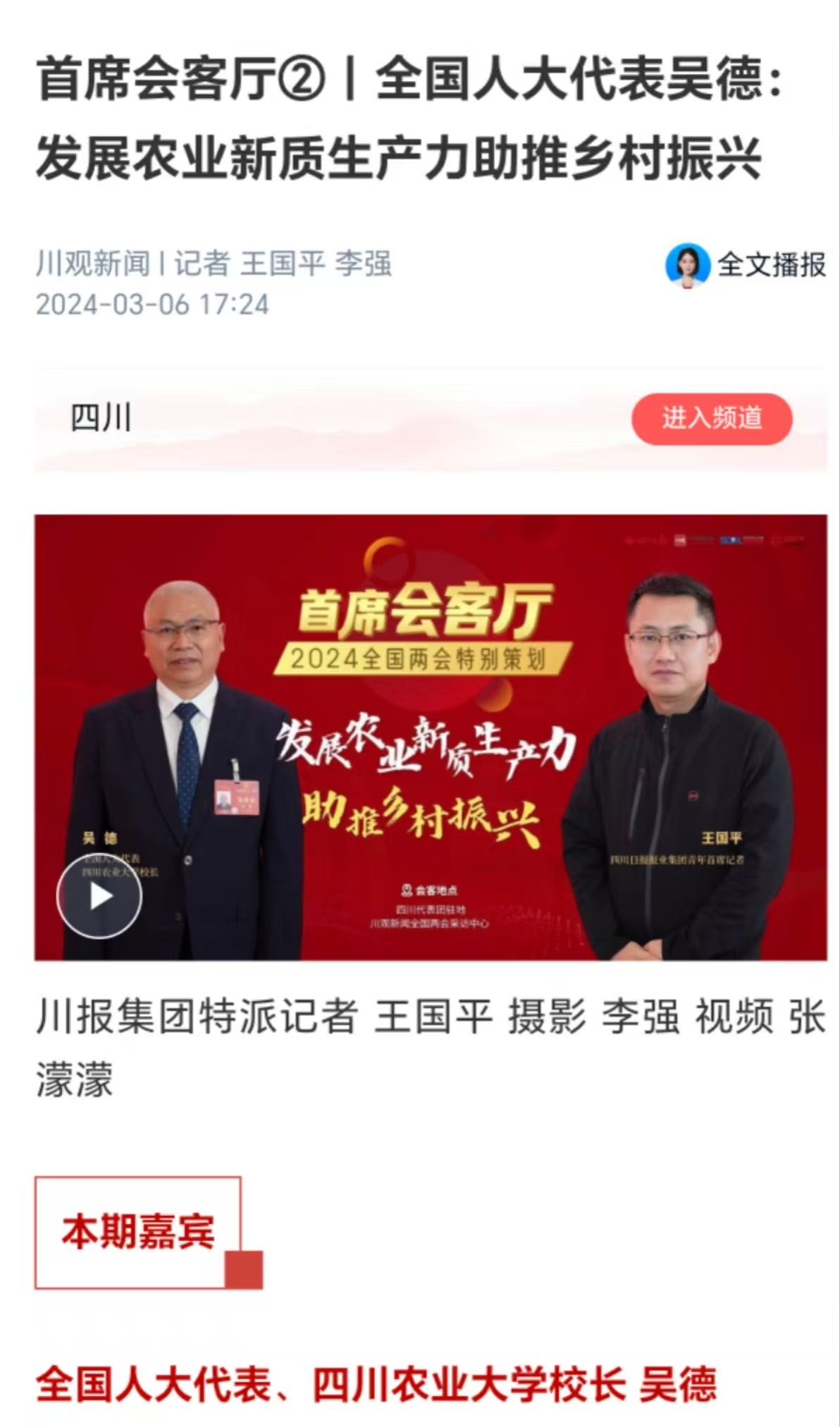 “乡村振兴的首要任务是加强粮食和重要农产品稳产保供,对于我们四川而言,就是要在新时代打造更高水平的‘天府粮仓’。”吴德说,“具体的做法,需要将科技和农业结合起来,大力发展农业新质生产力。”
