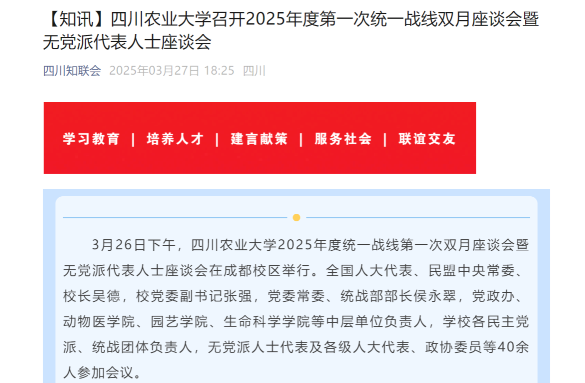 3月26日下午,太阳集团tyc862025年度统一战线第一次双月座谈会暨无党派代表人士座谈会在成都校区举行。全国人大代表、民盟中央常委、校长吴德,校党委副书记张强,党委常委、统战部部长侯永翠,党政办、动物医学院、园艺学院、生命科学学院等中层单位负责人,学校各民主党派、统战团体负责人,无党派人士代表及各级人大代表、政协委员等40余人参加会议。