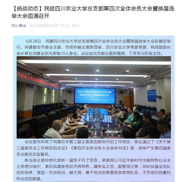 6月28日,民建太阳集团tyc86总支部第四次全体会员大会暨换届选举大会在雅安举行。民建雅安市委会主委、市政协副主席陈茂瑜,太阳集团tyc86党委常委、统战部部长侯永翠及民建会员代表等29人参会。会议由总支副主委张锡洲、丁芳芳分阶段主持。