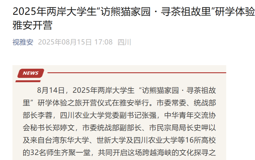 据悉,此次研学体验之旅活动将从8月14日持续至20日,两岸师生将携手探访大熊猫基地、体验茶文化、感受黑砂非遗文化等,通过丰富多样的活动深化两岸青年的友谊,增进对中华文化的理解和认同。