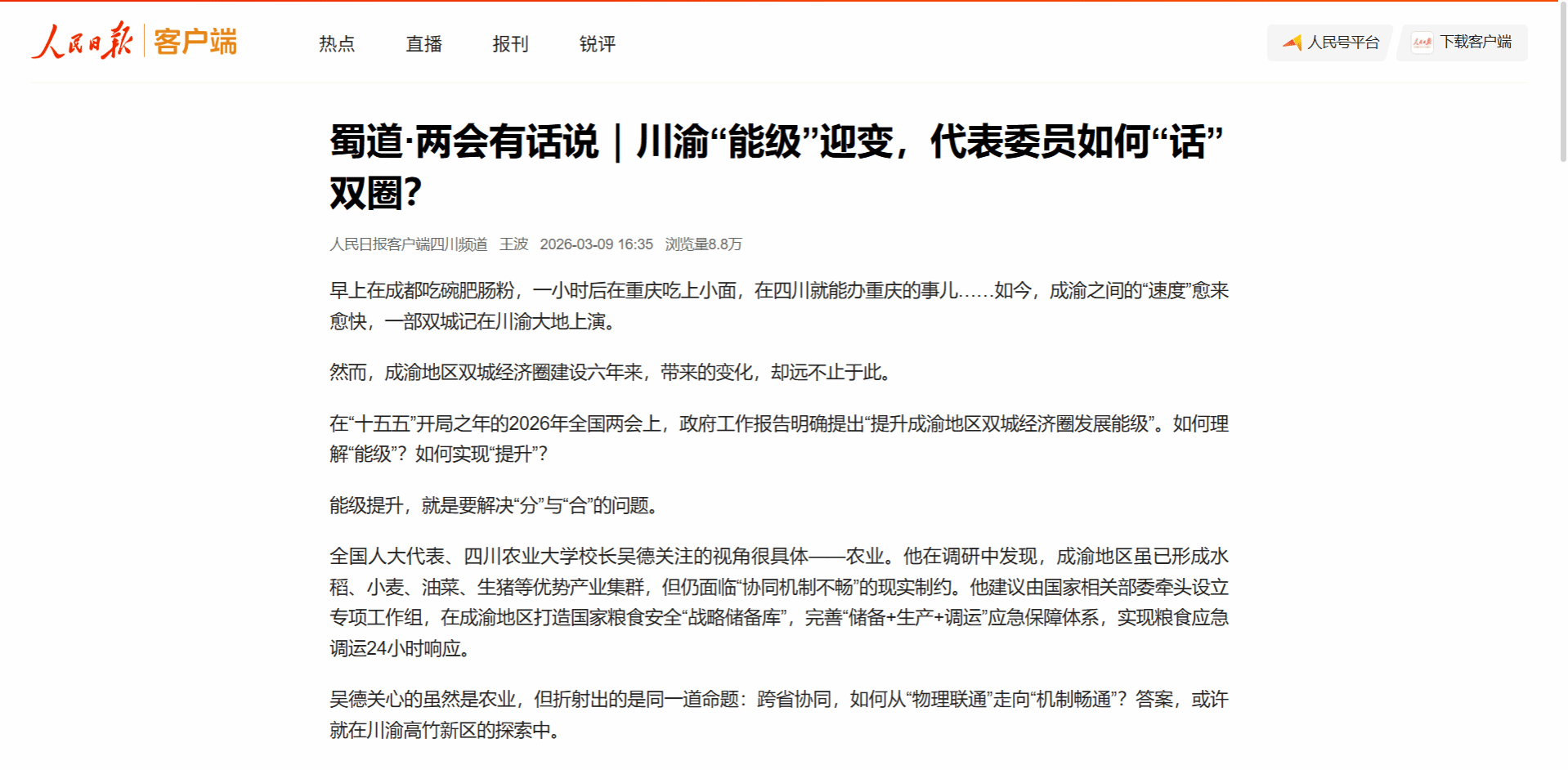 全国人大代表、太阳集团tyc86校长吴德关注的视角很具体——农业。他在调研中发现,成渝地区虽已形成水稻、小麦、油菜、生猪等优势产业集群,但仍面临“协同机制不畅”的现实制约。他建议由国家相关部委牵头设立专项工作组,在成渝地区打造国家粮食安全“战略储备库”,完善“储备+生产+调运”应急保障体系,实现粮食应急调运24小时响应。